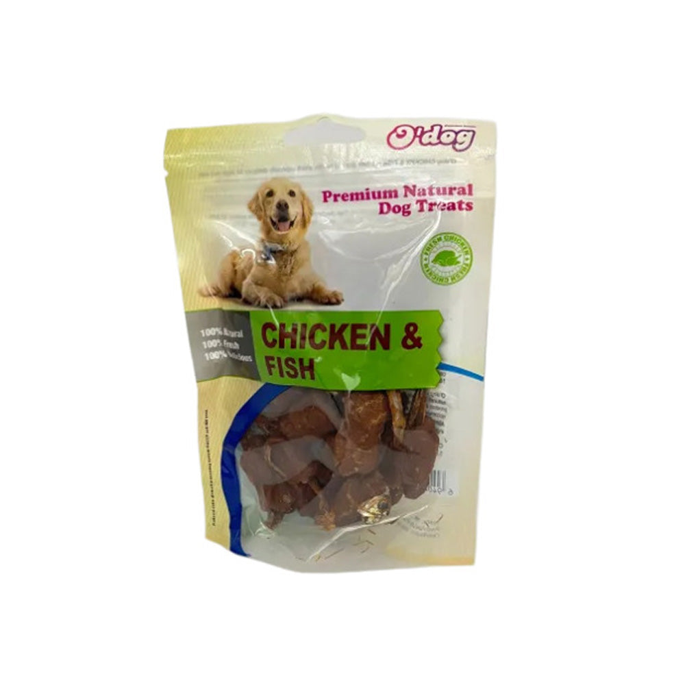 אודוג חטיף לכלב עוף ודג 100 גרם בקופסה, חטיף מזין המשלב שני סוגי חלבונים איכותיים, מתאים לכלבים עם דרישות תזונתיות גבוהות.