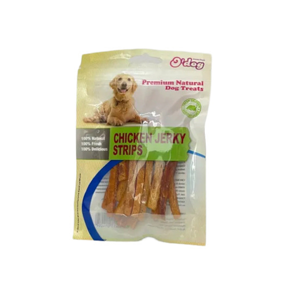 אודוג חטיף לכלב רצועות ג'רקי עוף 100 גרם בקופסה, חטיף עשיר בחלבון עם טעם עוף מיובש, מתאים לכלבים שאוהבים טעמים משובחים.